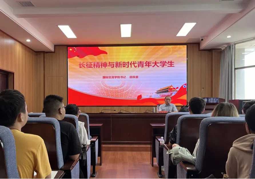 国际交流spbo比分网 直属支部委员会书记田良富同志作“长征精神与新时代大学生”的主题授课,他从长征历史的意义价值出发,讲述长征英雄的事迹,引导大家追寻长征足迹、感悟长征精神、坚定入党初心。