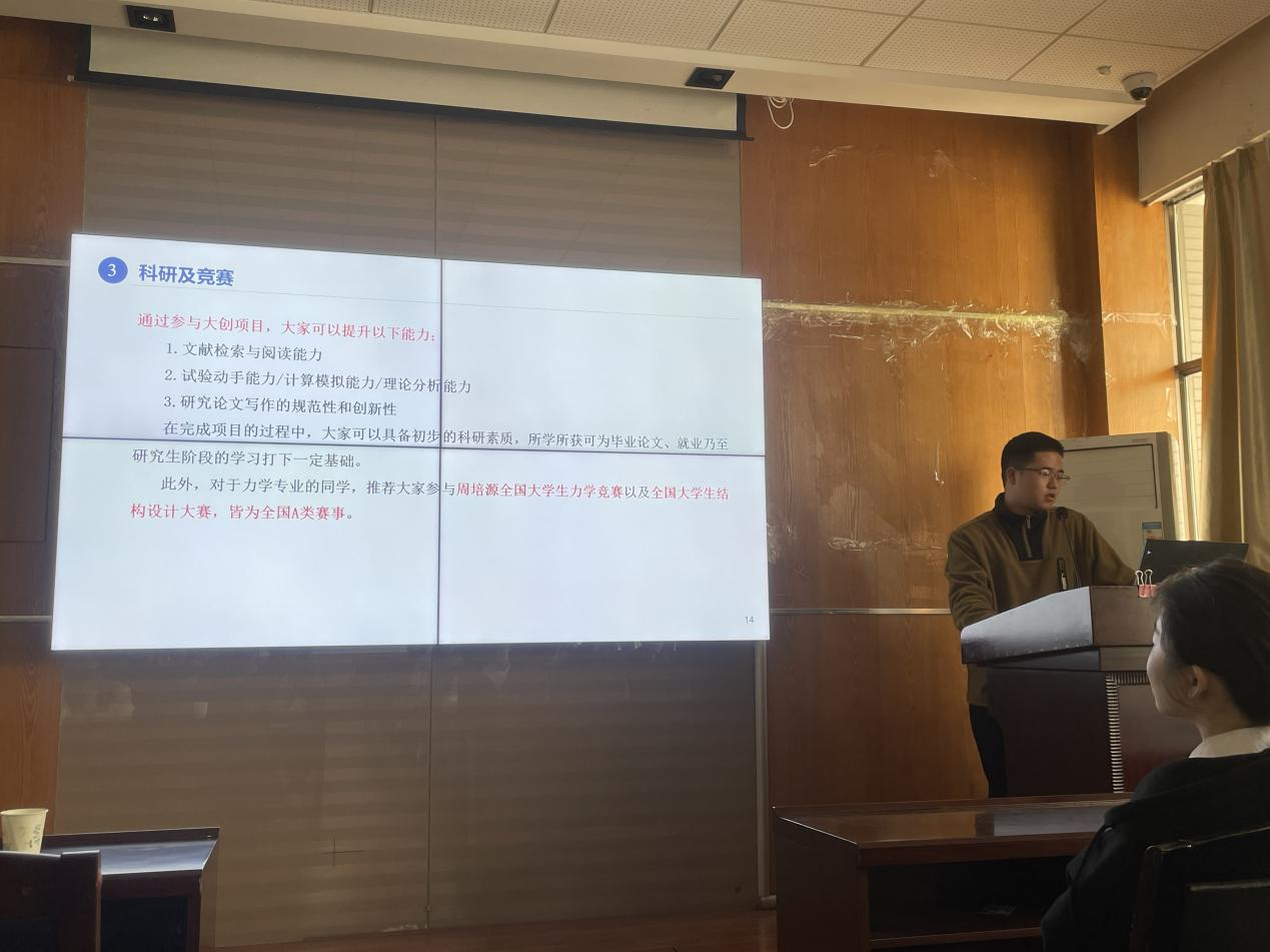 分享会上,首先是中共党员、综合测评专业第一、保研至东南大学同时也获得多所优秀大学offer、曾获2021中国大学生工程实践与创新能力大赛金奖等国家级奖项四项的刘洋为大家作经验分享。刘洋讲解了保研的主要流程和所需工作,并且以自身的经历风趣幽默地为机力院学子解释了目前的保研风向,以及今后的保研线下面试变动所带来的诸多机遇与学生面临的新挑战。