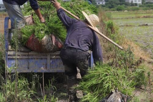 图为当地农民搬运水稻秧苗