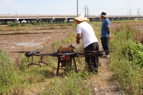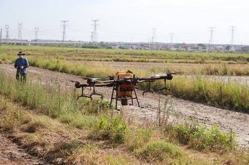 图为飞手操控无人机起飞打药