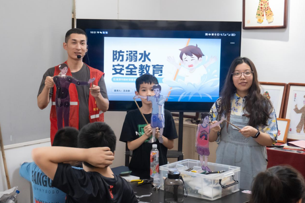 同时,实践团成员们也借此机会,用纸影演绎了一则防溺水寓言小故事。不同于平时的视频播放或PPT呈现的形式,纸影人物活灵活现,孩子们不由地被吸引,在纸影与科技的相辅相成中,孩子们将防溺水知识牢记在心。