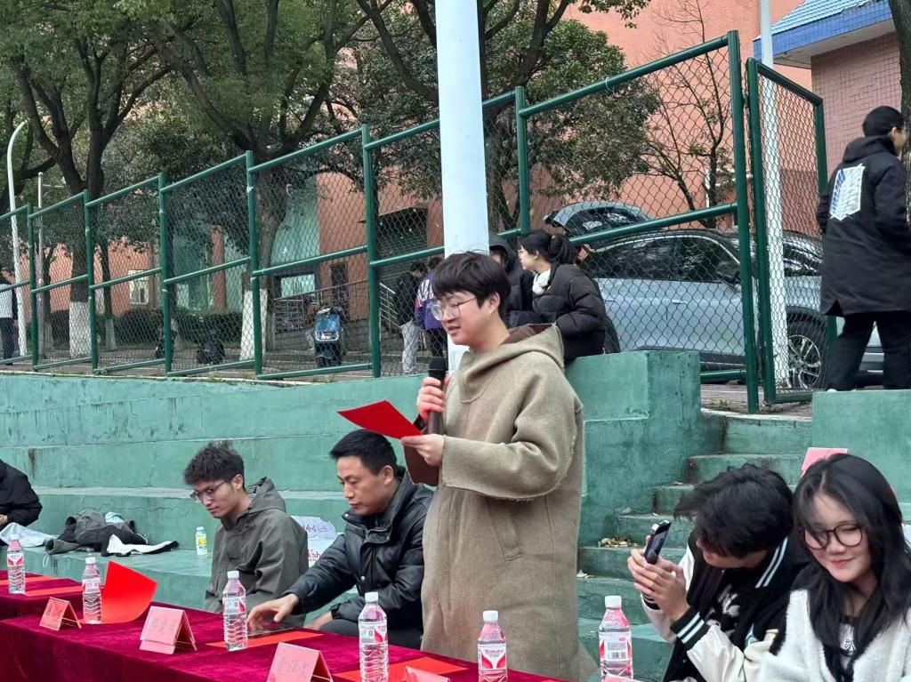 开幕式上,学工办曹译文老师发表了热情洋溢的讲话,他首先对本次赛事的顺利举办表示热烈祝贺,并向精心筹备赛事的组委会成员、辛勤付出的工作人员以及积极参与的师生们致以诚挚的感谢。与此同时,曹译文老师还对全体运动员提出了三点期望:第一,以安全为基,以友谊为桥;第二,以传承为魂,以创新为翼;第三,以文明为范,以精神为旗,以文明参赛为底色。相信运动员们定会铭记这些期望,在赛场上全力以赴,也期待此次赛事能成为一次增进交流、凝聚力量的盛会,激励更多同学投身体育。