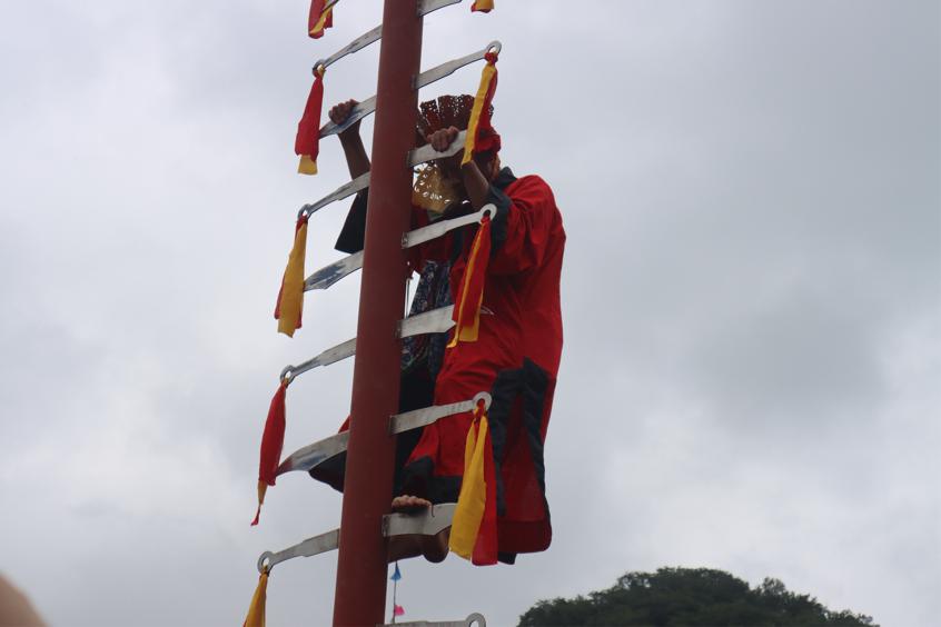巡游队伍穿过村庄民宅,走进空旷的田地。田地上有序插着彩色标旗,前方设祭坛,巴代队伍在田地里继续演绎绺巾舞。祭坛内两位师傅敲击战鼓,清脆的铃音与厚重的鼓声交织,仿佛一场穿越时空的对话,既是对先祖的告慰,亦是对天地的呼告。随后,三位巴代师傅走出队伍,在祭坛前主持祭祀仪式;仪式地点继而转移至田地旁的火海刀梯,巴代师傅先空手赤脚跨过滚滚的火海,再赤脚攀上刀梯,于顶端继续跳绺巾舞,祈求风调雨顺、五谷丰登。至此,巴代祭祀环节告一段落。