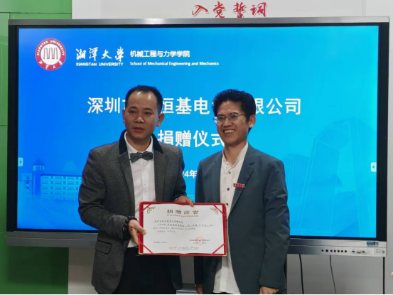 11月8日,捐赠仪式在spbo比分网-spbo体球网足球比分 313会议室举行。深圳市新恒基电气有限公司销售总监黄军、湘潭大学校友会副主任赵佳文、spbo比分网 党委副书记邓建勇出席。校友代表、教师代表参加捐赠仪式。