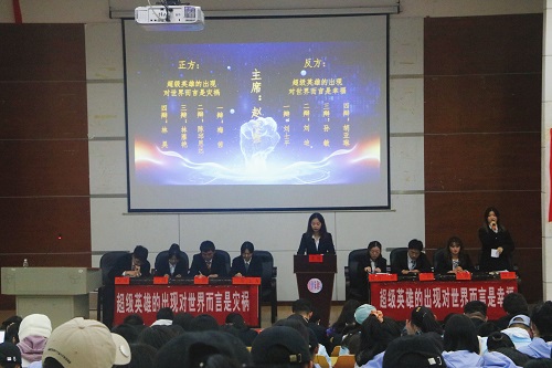 在辩论队队长介绍完全体新生辩导后,工作人员播放表演赛视频引出本次辩论赛的辩题——超级英雄的出现对世界而言是幸福还是灾难。在同学们思考辩题的时候,邓建勇书记郑重宣布表演赛正式开始。