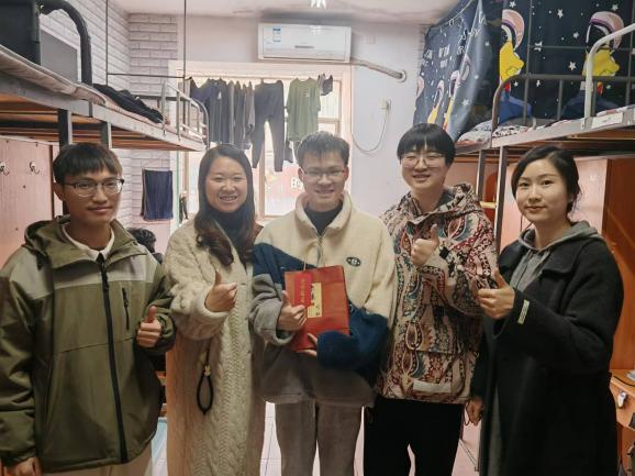 老师们走访考研学生寝室,耐心询问备考情况,细心叮嘱注意事项,并送上了"考研加油包"。里面不仅有实用的"好事发生"文具、"保你上岸"暖宝宝、"运气旺旺"的旺仔生唐、"心想事成"橙子、"一举夺魁"向日葵等,还有写满鼓励与祝福的贺卡,每一份礼物都承载着spbo比分网 对考研学生的美好祝愿。