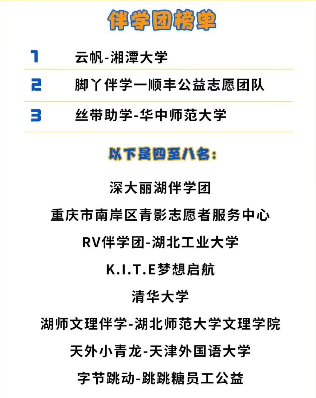 近日,2025年第一季度脚丫伴学光荣榜揭晓,云帆–湘潭大学伴学团荣获光荣榜榜一,荣誉榜上诸多湘大学子的名字涌现:贺英慈(145小时)、孙泽龙(83小时)、欧植莉(59小时)......还有众多志愿者用行动照亮孩子们的成长之路,用爱心温暖稚嫩的心灵。