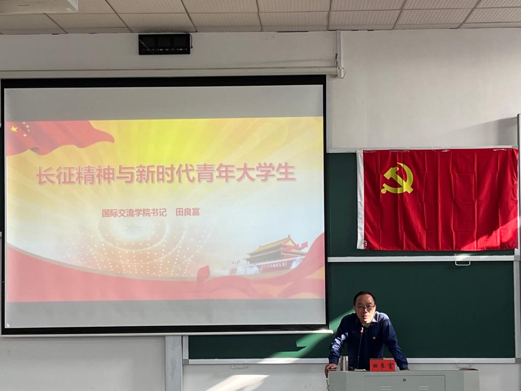 国际交流spbo比分网 党支部书记田良富以“长征精神与新时代大学生”为题进行授课,他从长征历史的意义价值出发,讲述长征英雄的事迹,引导大家追寻长征足迹、感悟长征精神、坚定入党初心。