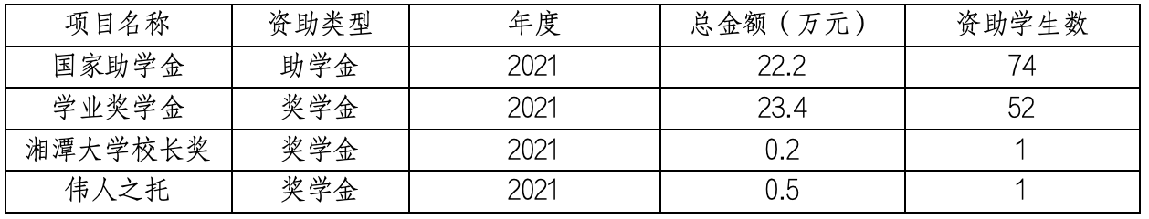 2021年,在校研究生获得奖学金比例再创新高,其中,国家助学金资助74人,总金额22.2万元,学业奖学金资助52人,共计23.4万元,湘潭大学校长奖学金资助1人,总金额0.2万元,伟人托举奖学金资助1人,总金额0.5万元。同时,在校同学踊跃撰写文章、积极投稿,不断在科研道路上求索。
