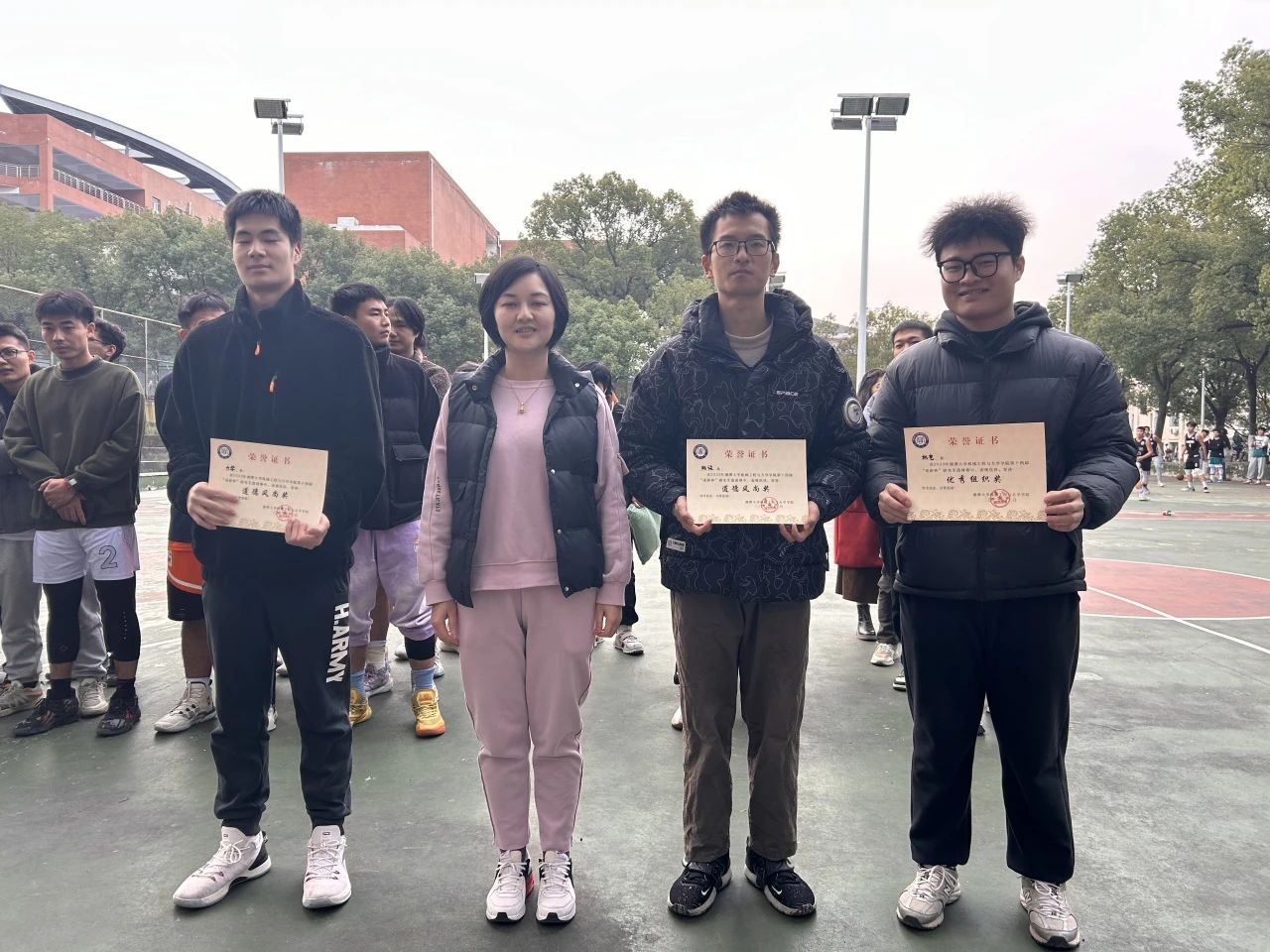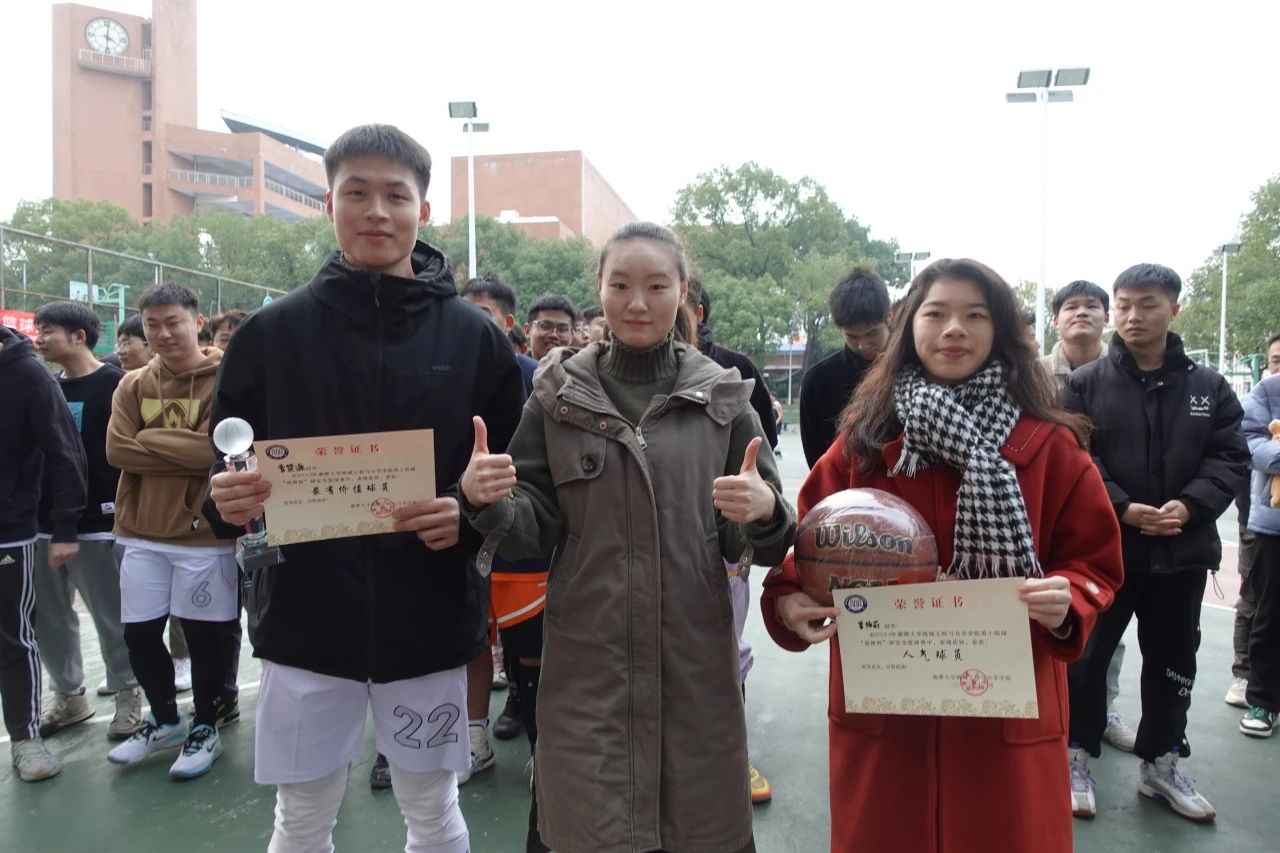 于慧美老师宣读了第十四届“迎新杯”研究生篮球赛的最终获奖名单。获得冠军的队伍是机制队,亚军的队伍是能动队,季军的队伍是材料队;获得优秀组织奖的是机电队,道德风尚奖的队伍是力学队和机设队;最有价值球员是曹楚源;最佳女球员是伍娜;人气球员是曾杨莉;三分大赛冠军是孙超。恭喜以上获奖队伍和个人!