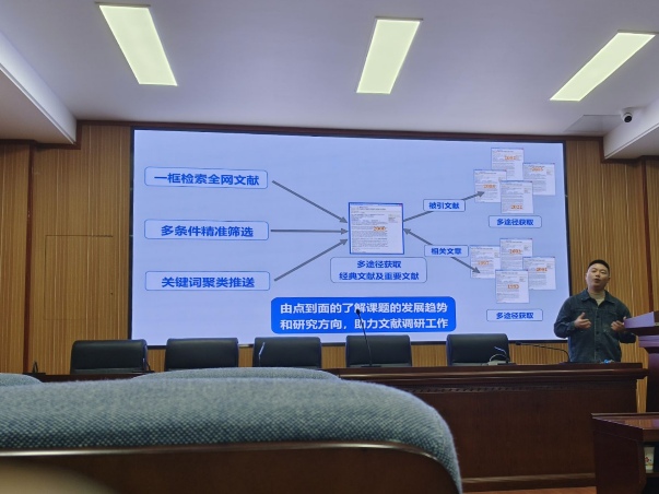 接着,刘俊详细讲述了数据库的检索界面,数据库内包含了2000万开放资源,通过搜索关键词、选择出版物等能帮助用户快速筛选优质期刊,同时,刘俊提到数据库还有一个重要功能是能匹配和推送与检索文献相关度较高的其他文章,这更便于研究生们深入了解课题发展。