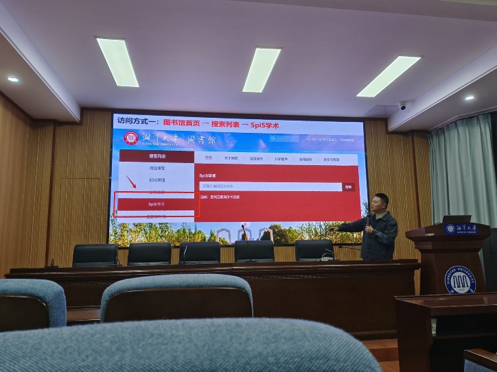 论坛伊始,刘俊为大家介绍了访问“Spischolar学术资源在线”的方式:首先进入湘潭大学图书馆主页,接着进入搜索列表,找到“SpiS学术”一栏,搜索相关内容即可。刘俊提到,在研究生生活,图书检索的重要性不容忽视,如何高效获取学术资源、提升研究效率是最主要的。刘俊说:“这一数据库恰能将主流的期刊评价体系关联到期刊资源,实现不同类型学术资源的无缝链接,从而追踪最新研究动向,便于我们获取科研文献。”
