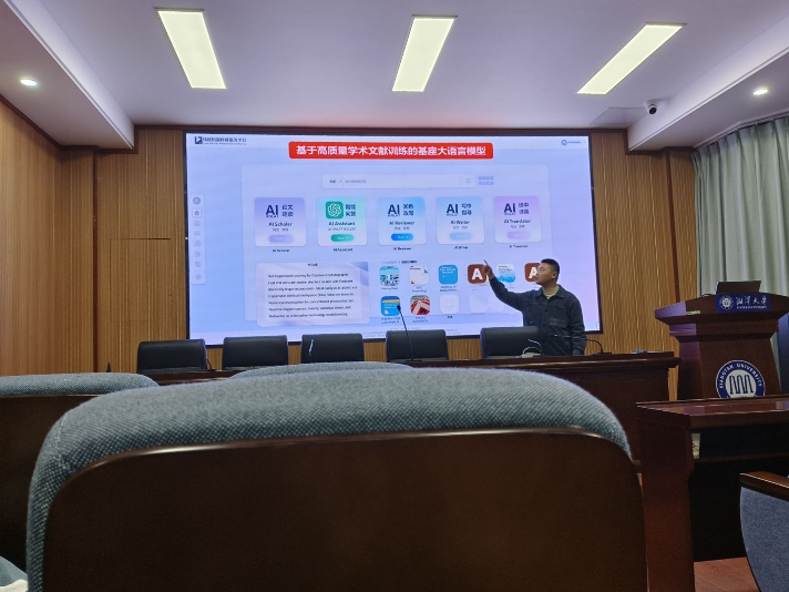 除了“Spischolar学术资源在线”数据库,刘俊还为大家展示了“纬度悟源科研服务平台”的访问方式,同样,在进入湘潭大学图书馆主页的数据库列表后,分别筛选首字母“W”和“试用”就能进入服务平台。刘俊介绍到,这一服务平台是基于高质量学术文献训练的大语言模型,它能够根据检索的文献内容,提供相关问题推荐,从而帮助大家深入理解原文。此外,它还包括了智能问答、润色改写、写作指导和中英文翻译等多个功能,这一辅助工具能更好的激发读者的探索与思考,加深对主题领域的理解。