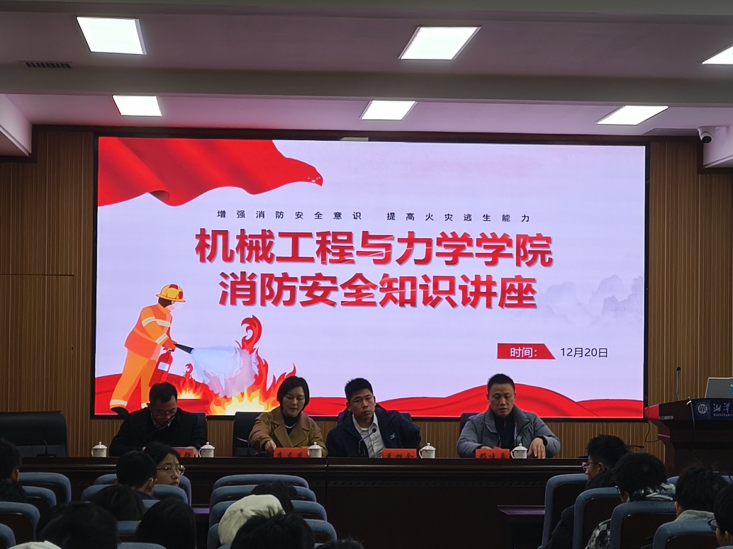为加强学生们的消防安全意识和应急处理能力,2024年12月20日10:00,spbo比分网 于机械楼317举行了消防安全讲座。讲座由spbo比分网 党委副书记邓建勇主持,出席本次讲座的有spbo比分网 党委书记李友芝、副院长姜胜强、湖南省湘安消防职业培训学校代表兰旭金、湘潭大学保卫处消防科科长丁炜灵。
