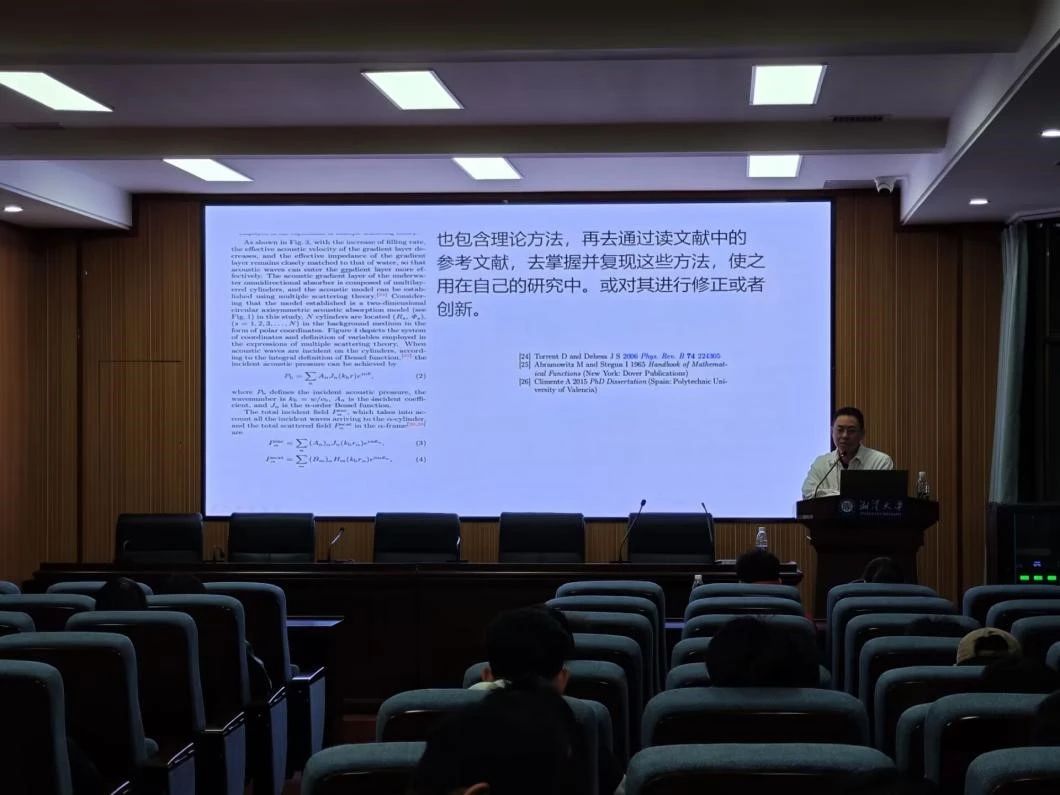 梁霄副教授从科研方法论与心态调整切入,强调科研需以“定方向、看文献、做研究”为核心,结合国家与社会需求选择研究方向,注重文献复现与创新思路积累,并呼吁学生“少熬夜、强制放假、拒绝内卷”。他通过展示团队在声学黑洞结构、隔声降噪等领域的20余篇SCI论文及多项专利,鼓励学生扎实深耕,祝愿早日实现“发sci”的科研目标。