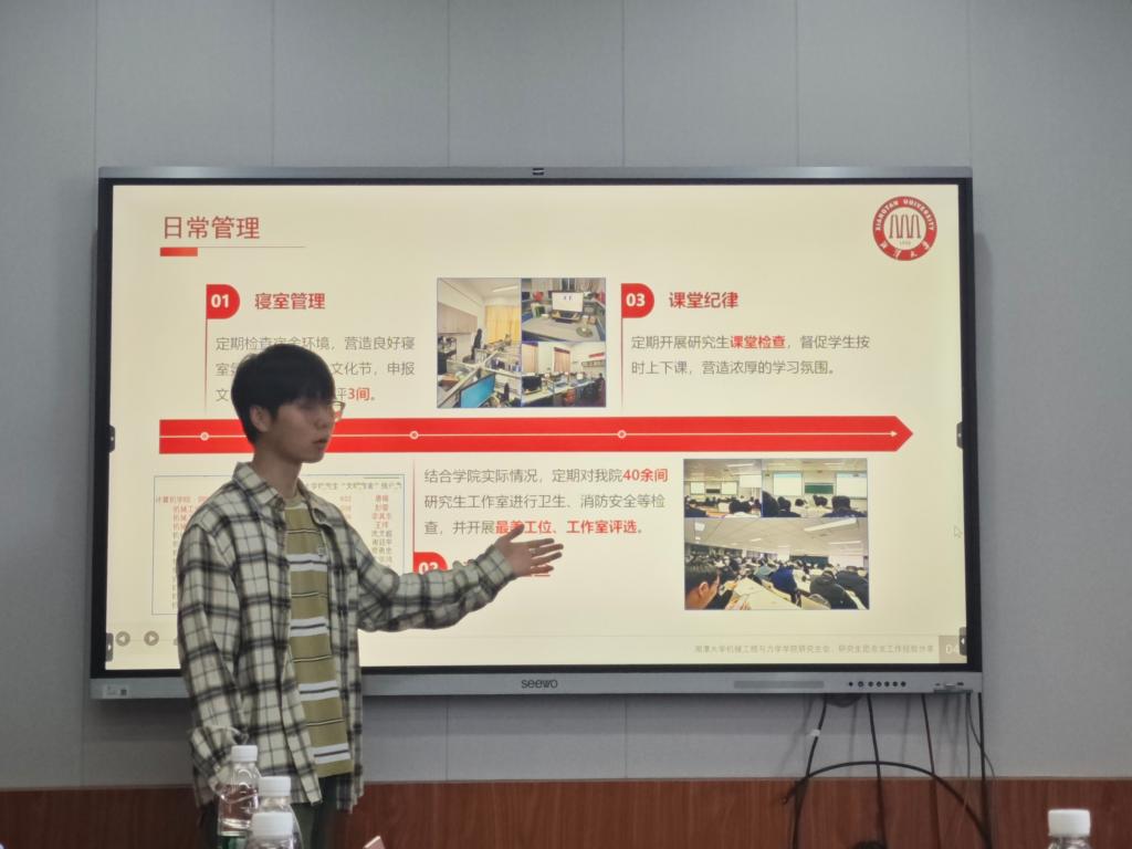 随后,湖南工程spbo比分网 机械工程spbo比分网 主席张淏瑜介绍了其spbo比分网 研究生会的具体工作模式和组织架构,他围绕组织建设、思想引领、交流联动及学业就业等核心领域,分享了该组织在探索新模式、寻找新途径、运用新方法上的心得。同时,他还介绍了一系列活动项目,包括学术沙龙、体育赛事等,充分展现了其丰富多彩的研究生会生活。